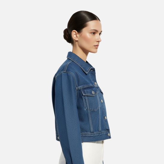 Elevate your everyday look with this modern cropped denim jacket, crafted in a soft Dark-blue wash for a clean, minimalist aesthetic. Designed with a structured silhouette, it features a classic spread collar, silver-tone button fastening, and dual chest flap pockets that add a timeless touch. Tailored seams and a slightly boxy fit create a flattering, contemporary shape that pairs effortlessly with high-waisted trousers or skirts.