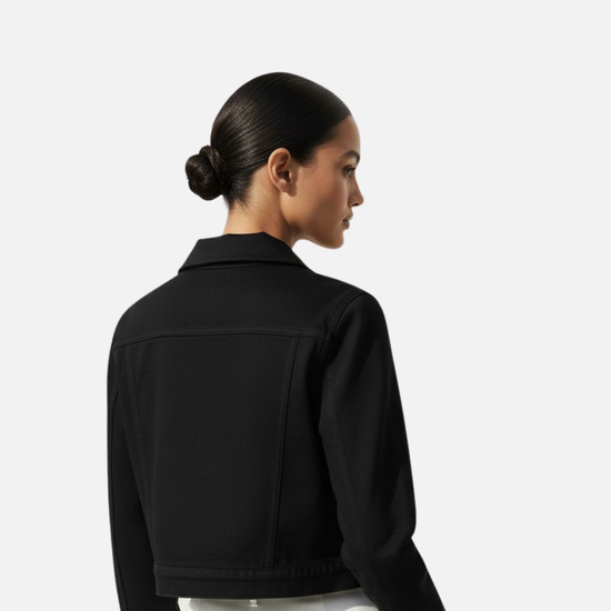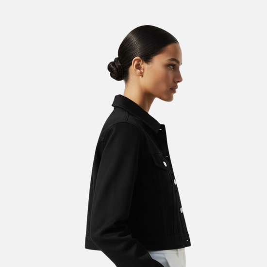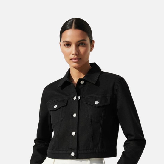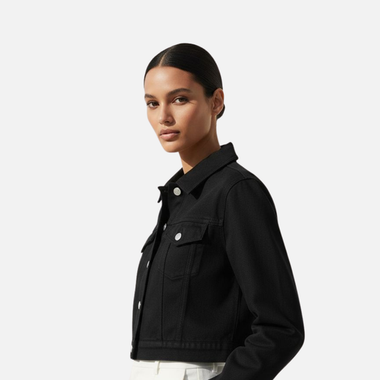 Elevate your everyday look with this modern cropped denim jacket for women, crafted in a soft Black wash for a clean, minimalist aesthetic. Designed with a structured silhouette, it features a classic spread collar, silver-tone button fastening, and dual chest flap pockets that add a timeless touch. Tailored seams and a slightly boxy fit create a flattering, contemporary shape that pairs effortlessly with high-waisted trousers or skirts.