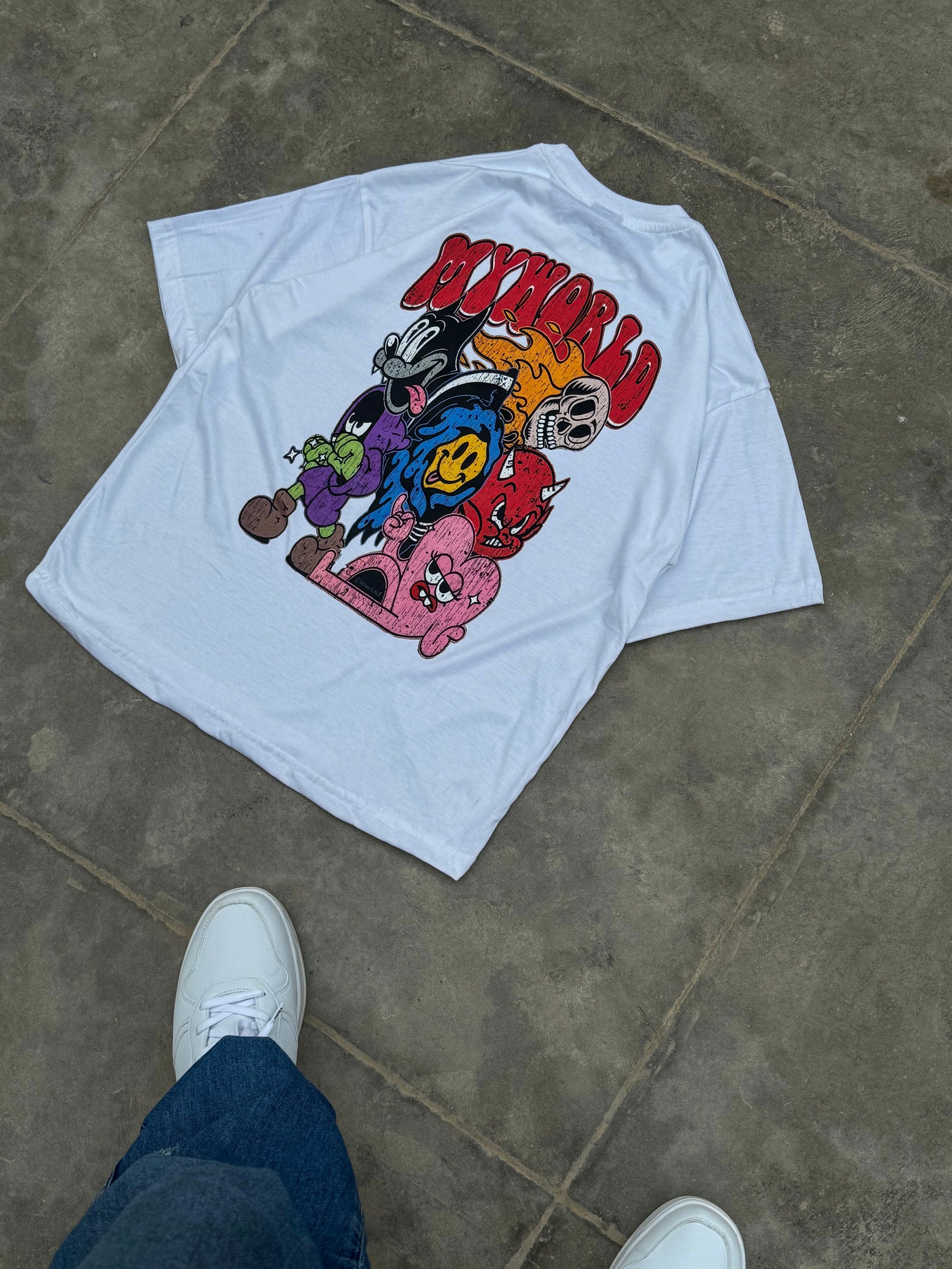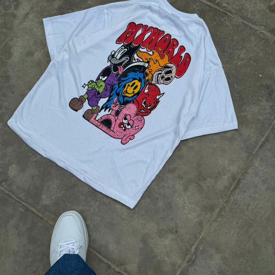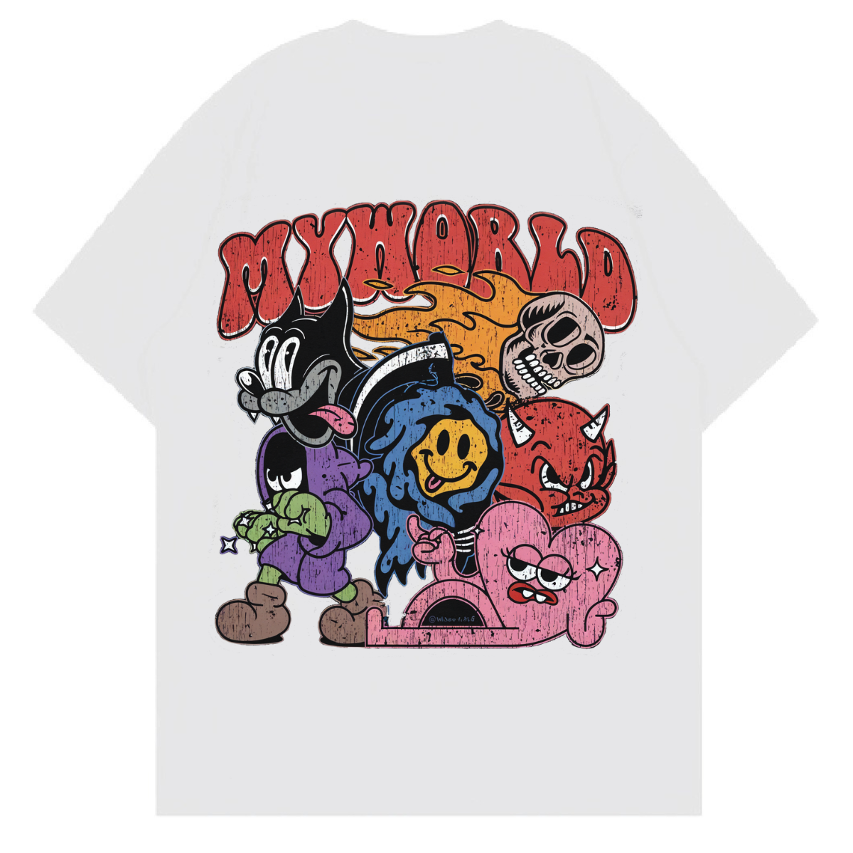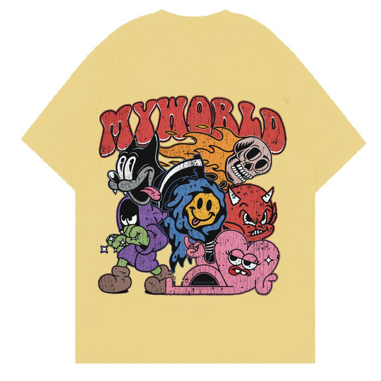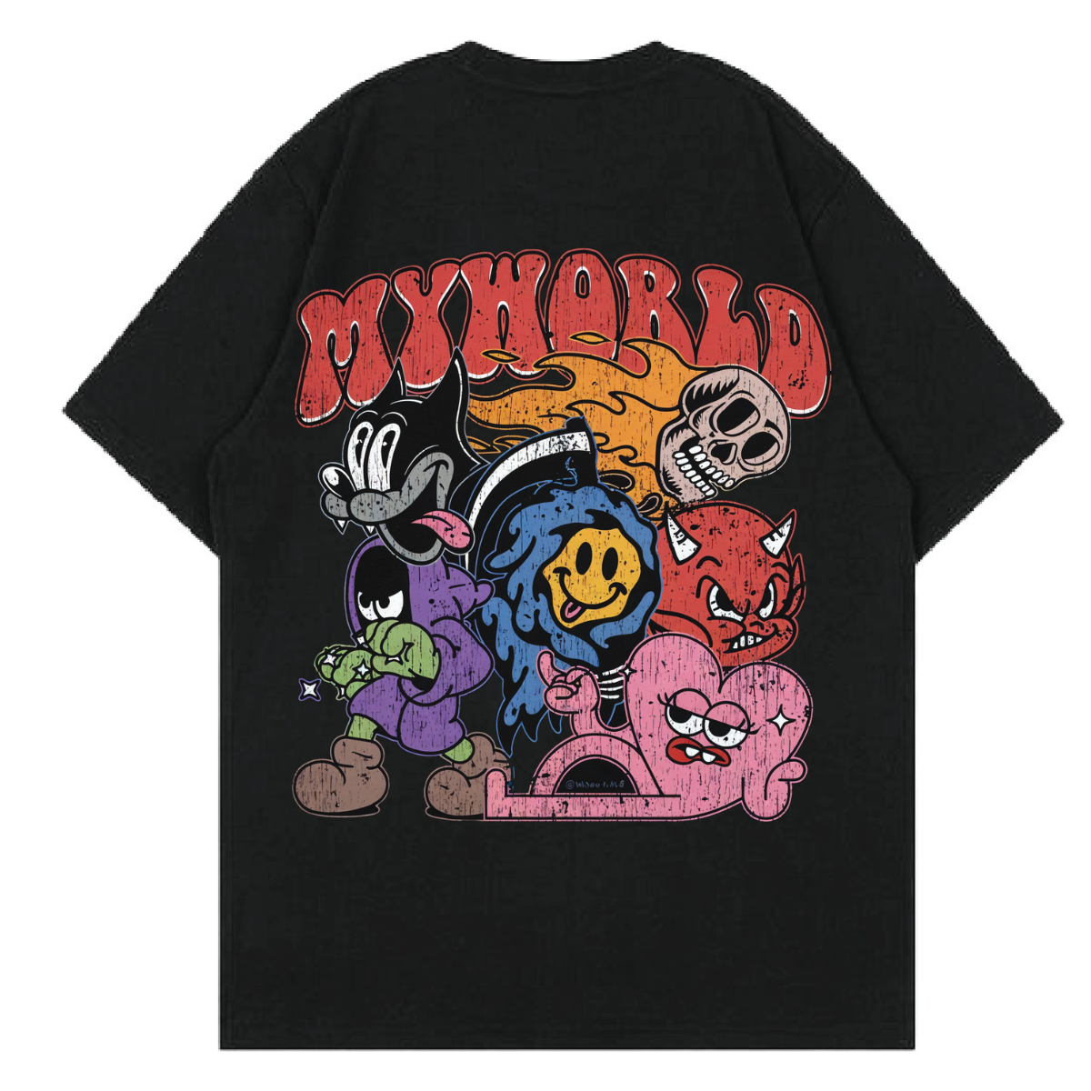 Enter MYWORLD โ where chaos meets creativity. This oversized tee features a cast of rebellious, cartoon-inspired misfits brought to life in a vibrant, distressed print. Each character expresses a different emotion, capturing the beautiful mess of Gen Z identity, energy, and edge. Made from heavyweight 200GSM jersey, it's a wearable statement for those who live unapologetically. Available now on SNAZZ!