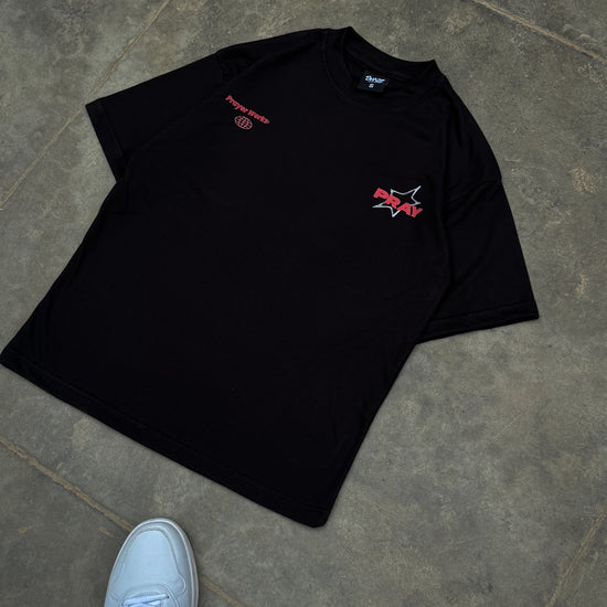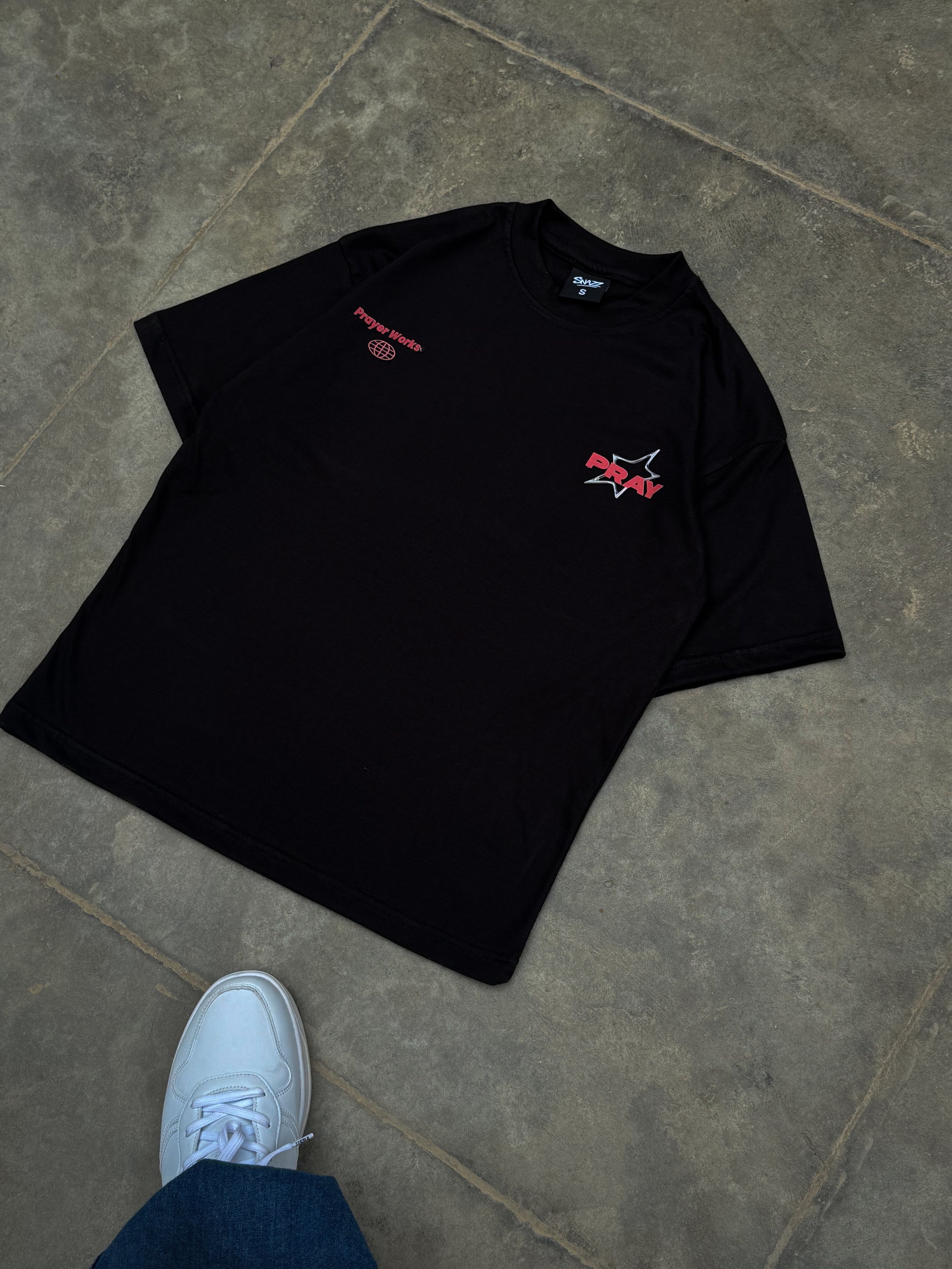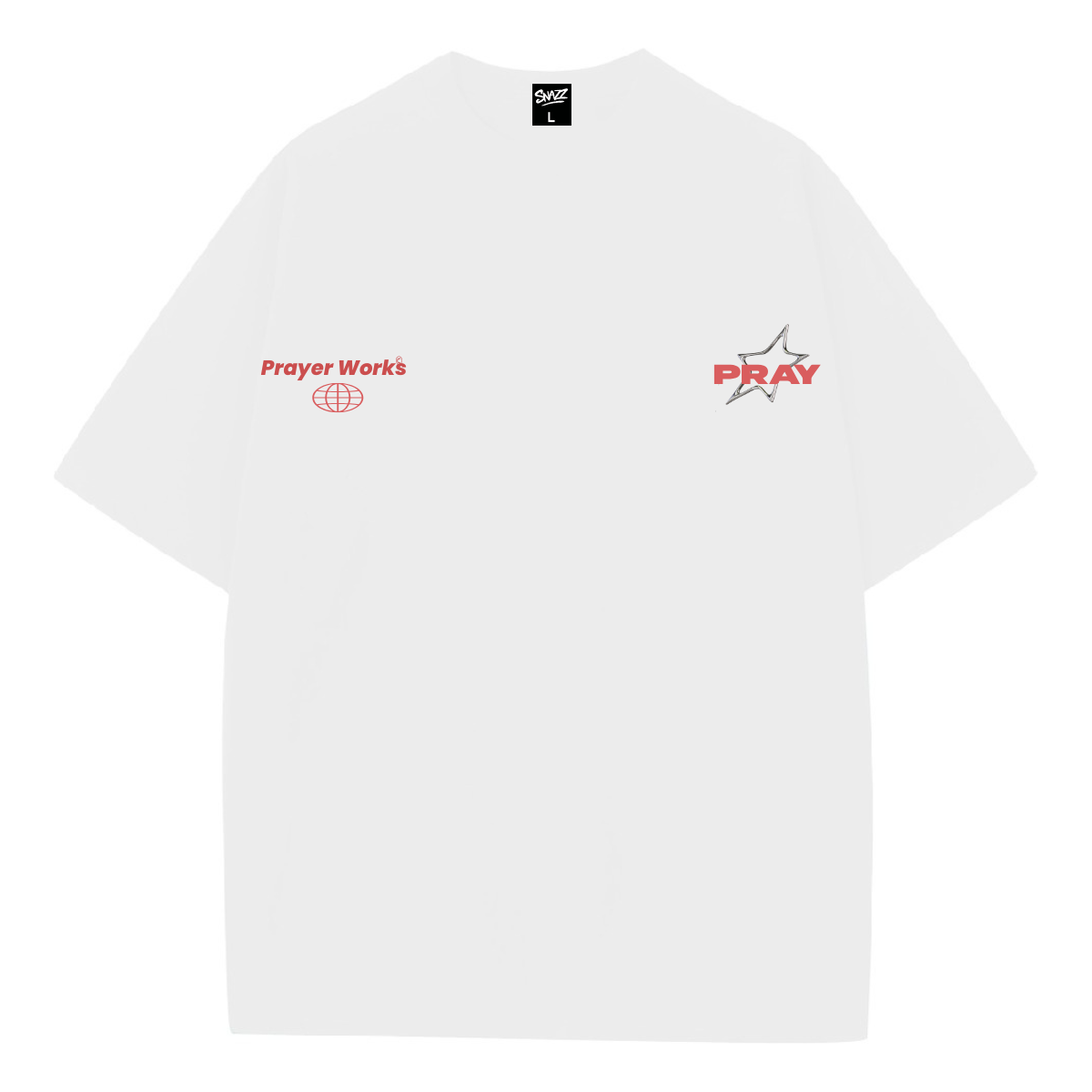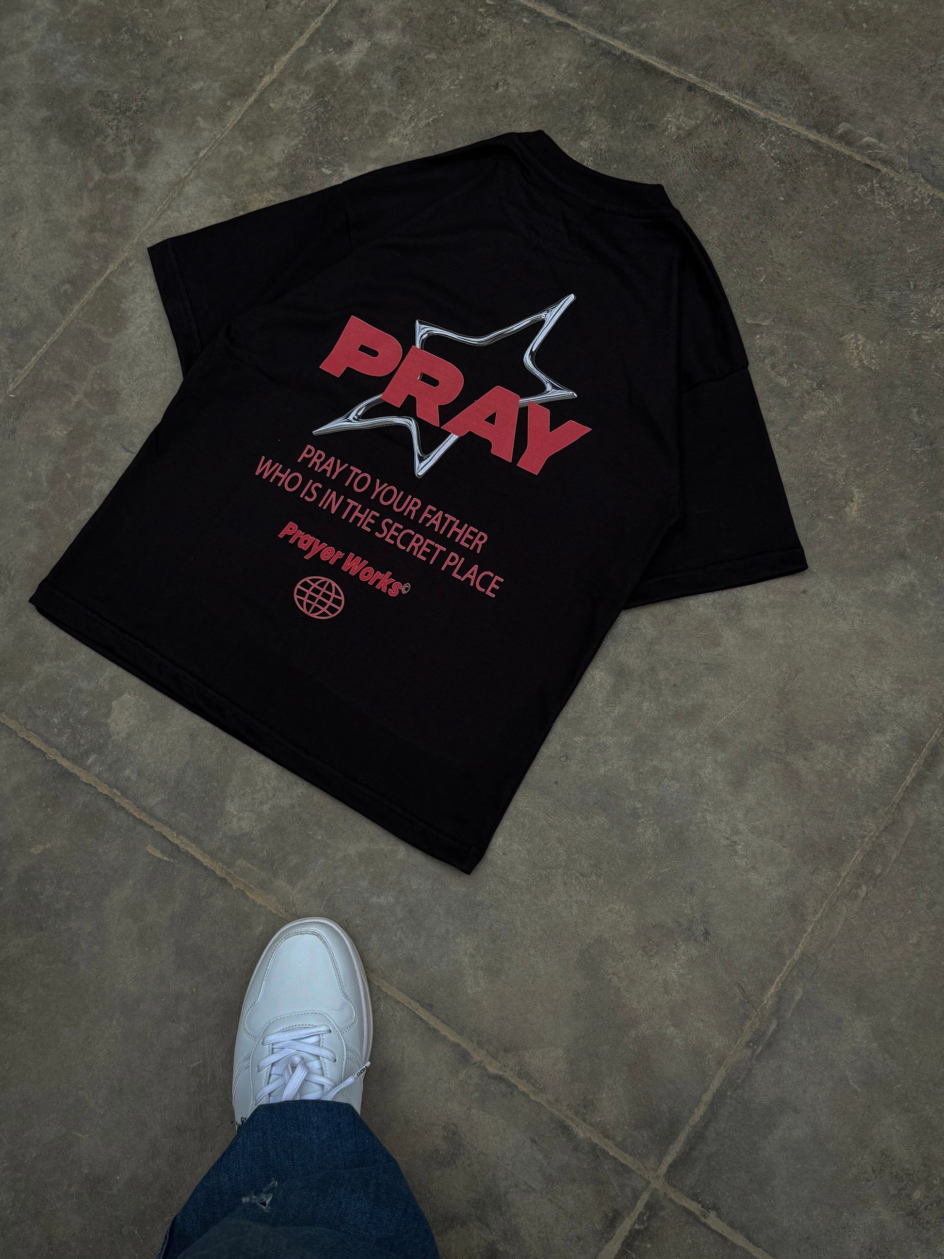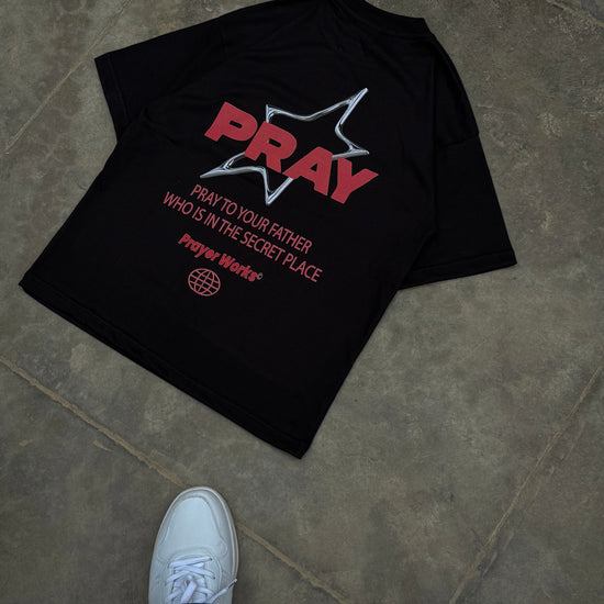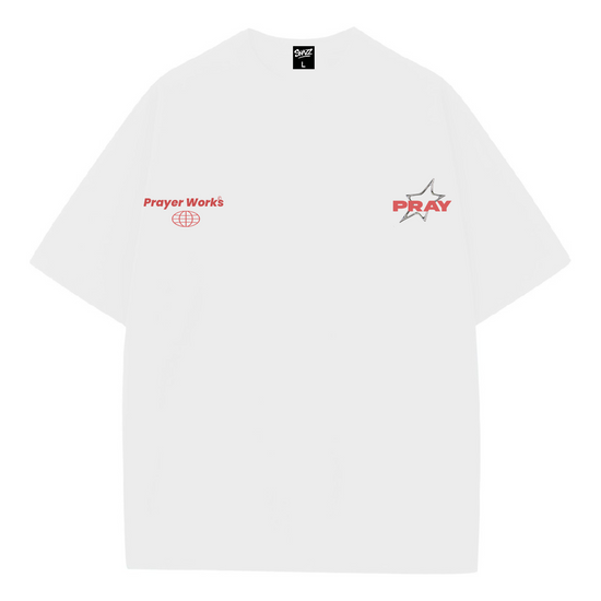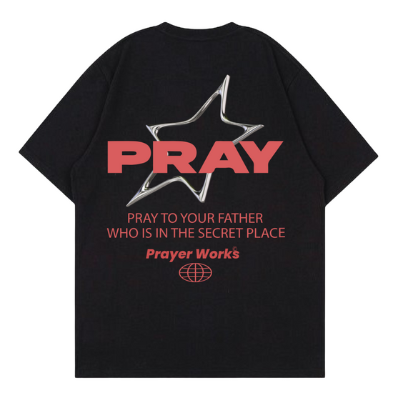 Channel bold faith and street-inspired style with our “Prayer Works” Oversized Graphic Tee. This statement piece features an eye-catching chrome star motif with the powerful “PRAY” graphic and uplifting scripture: “PRAY TO YOUR FATHER WHO IS IN THE SECRET PLACE”. Finished with the subtle “Prayer Works®” branding and a globe icon, this tee embodies a modern spiritual streetwear vibe.