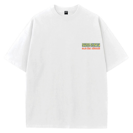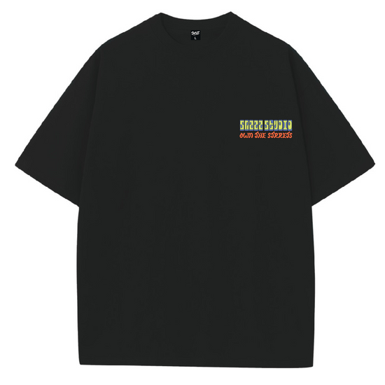The “RUN STAR” tee is a loud celebration of movement, sneakers, and Gen-Z energy. Bursting with psychedelic pop graphics — featuring chunky cartoon kicks, smiley faces, and retro-styled typography — this tee screams skatepark chaos and downtown rhythm. The vibrant neon colorway, curved text forms, and 90s sneaker ad aesthetics give it an animated, almost in-motion vibe, like you could step out of a zine or an arcade game.