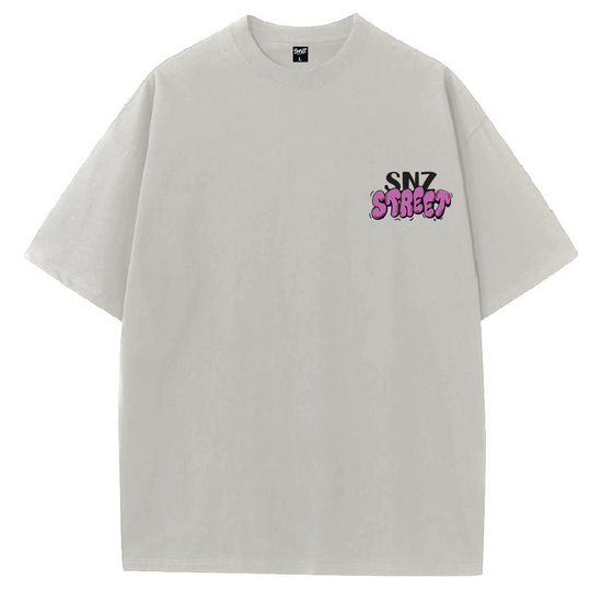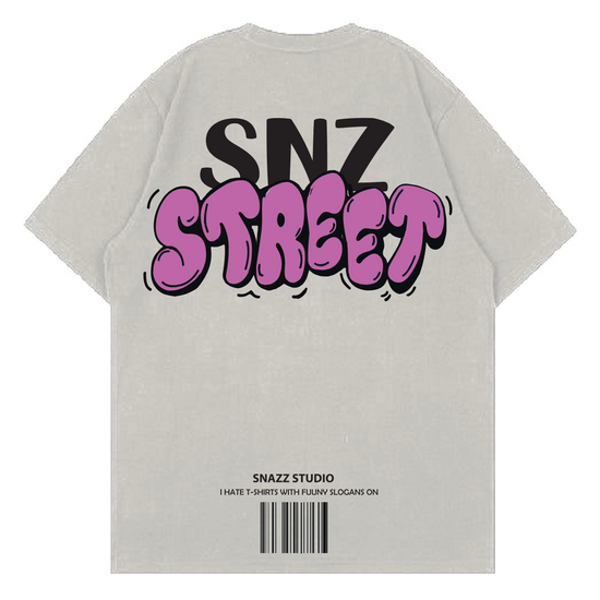 The SNZ STREET tee is a tongue-in-cheek tribute to bold self-expression — calling out cheesy slogans while flexing a street-art flair. It’s graffiti meets sarcasm, wrapped in a soft, neutral-toned oversized fit. Featuring chunky bubble-style graffiti in pastel purple over bold SNZ typography, this piece makes a statement without trying too hard. A barcode and ironic text — “I HATE T-SHIRTS WITH FUUNY SLOGANS ON” — turn this drop into wearable satire.
