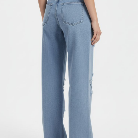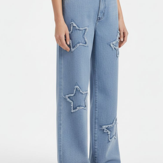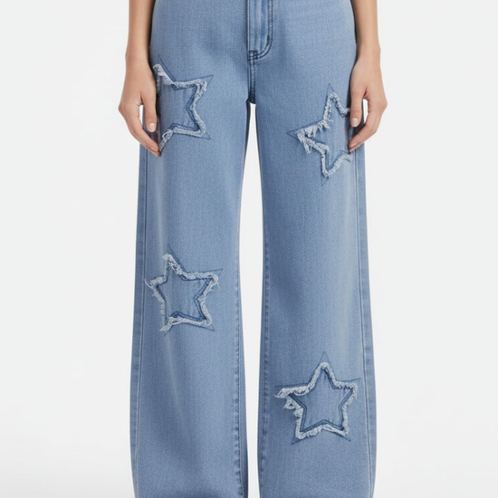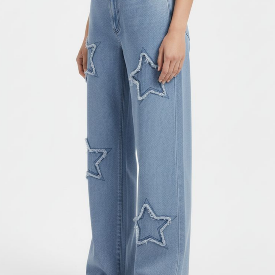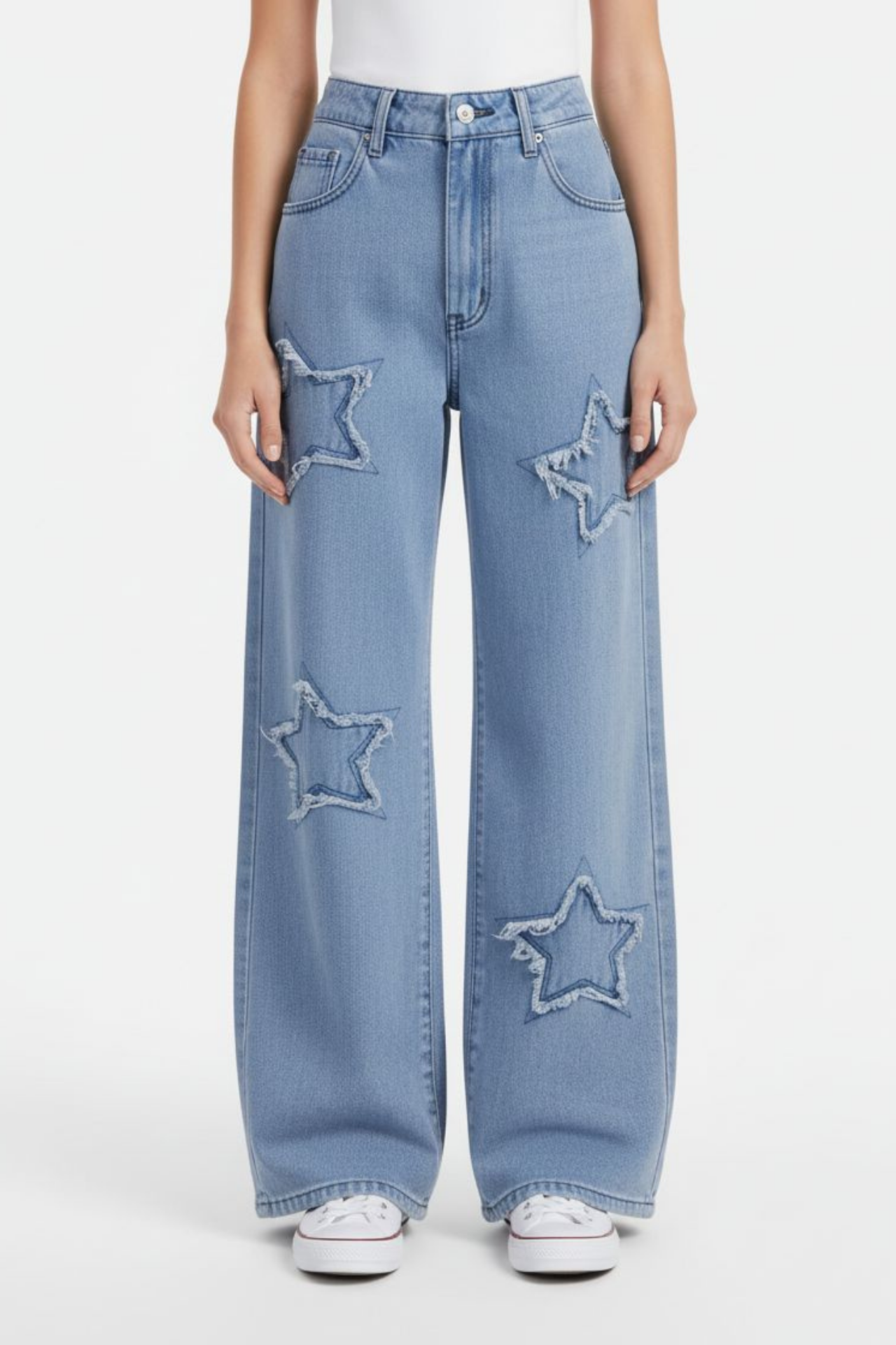 Make a bold statement with this pair of black wide-leg jeans featuring eye-catching star embroidery. Crafted from premium stretch denim, these jeans offer both comfort and edge with their relaxed silhouette and high-rise fit that flatters every figure. The tonal star detailing adds a playful yet sophisticated twist, perfect for turning everyday outfits into standout looks.