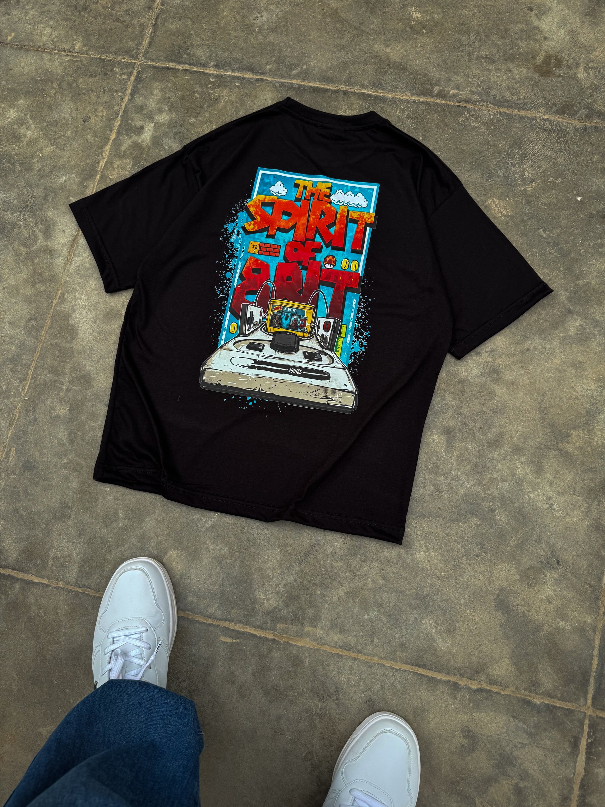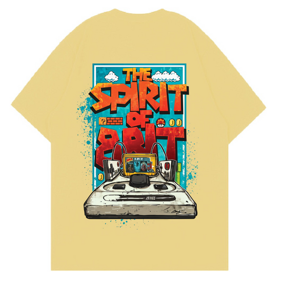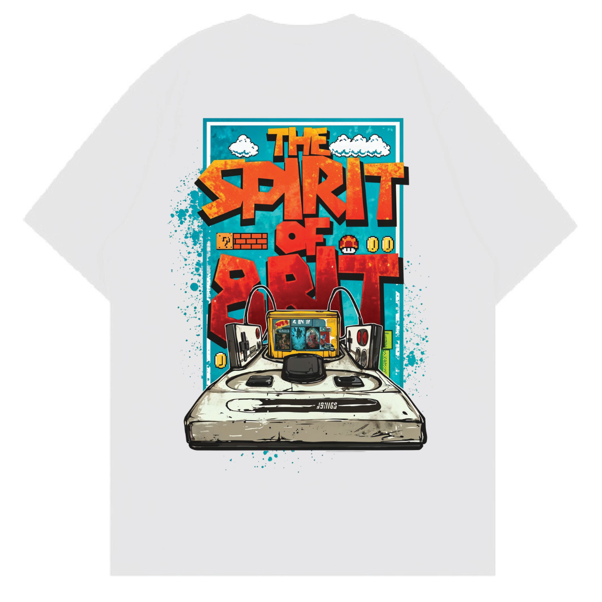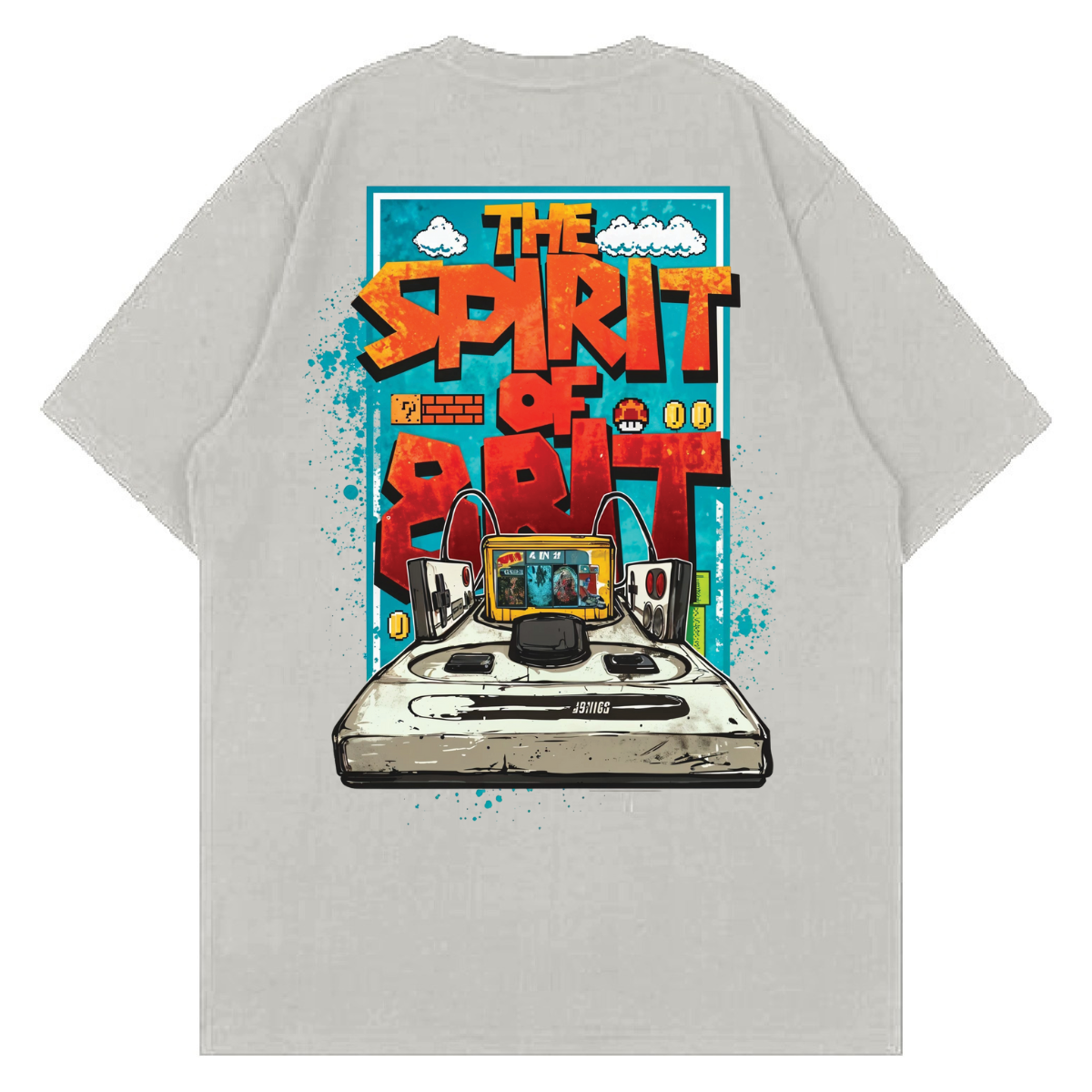 Step into nostalgia with "The Spirit "Tee, a tribute to the golden era of retro gaming. Featuring a bold and vibrant graphic of a classic console setup and pixel-perfect typography, this design brings old-school energy to modern streetwear.