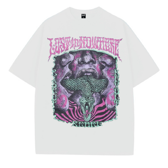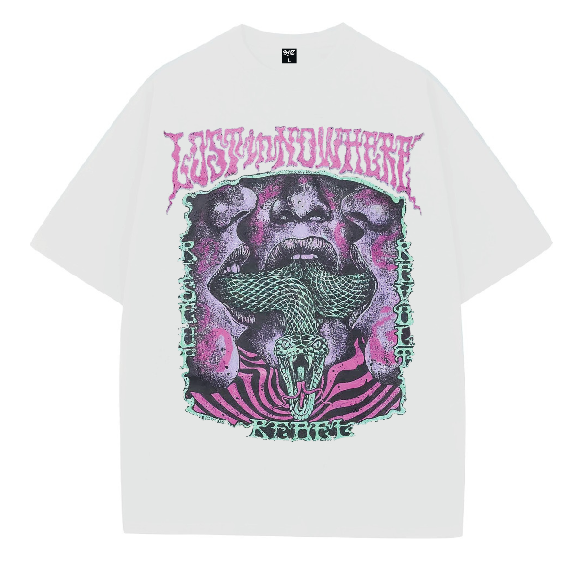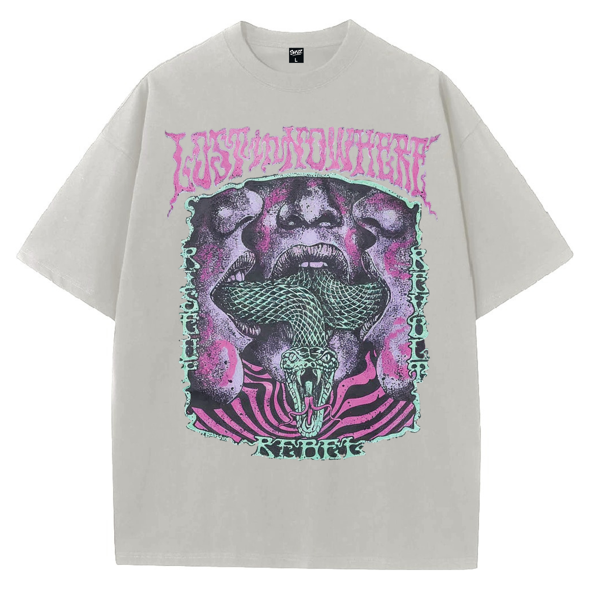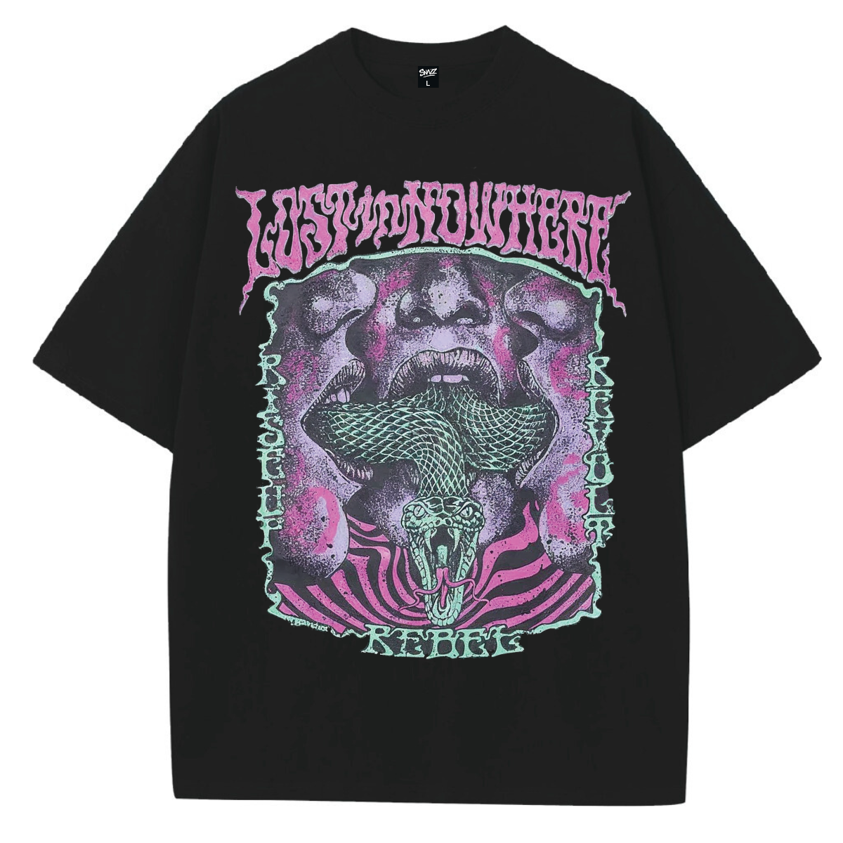 Enter the chaos with the Venom Rebellion Tee — a dark psychedelic piece that screams rebellion from every inch. Dominated by a vivid illustration of a striking cobra emerging from a chorus of screaming stone faces, this tee captures the raw intensity of inner rage and revolution. Surreal typography reads “LOST TO NOWHERE” and “RISE UP / REVOLT / REBEL” along the border in acid-washed lilac and mint tones. Made from lightweight 200GSM jersey, it's a wearable statement for those who live unapologetically. Available now on SNAZZ!